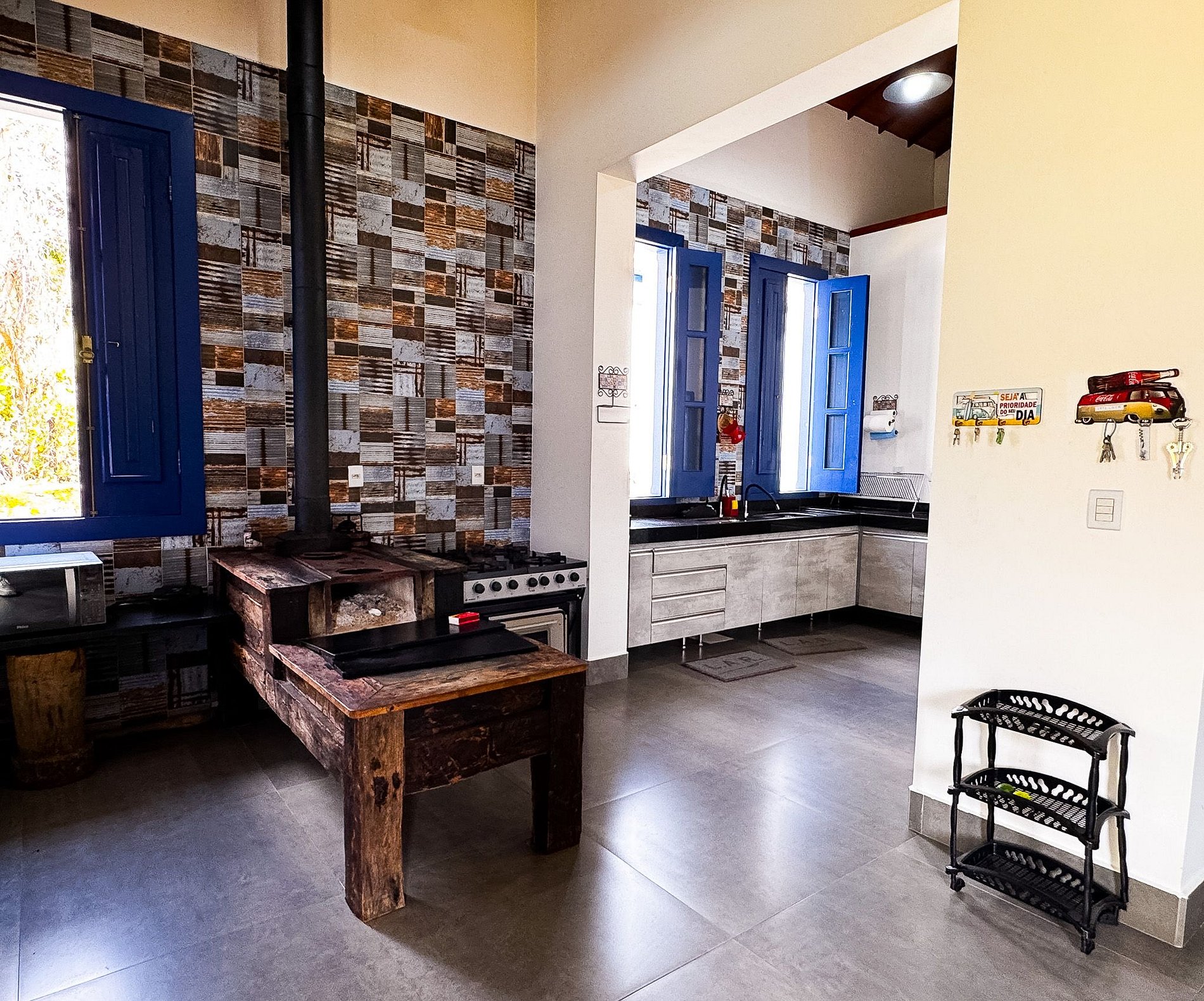 Cozinha equipada com: fogão a lenha, fogão industrial, forno a gás, geladeira de 3 portas, freezer para cerveja, despensa, misteira, micro-ondas e filtro Soft purificador de água