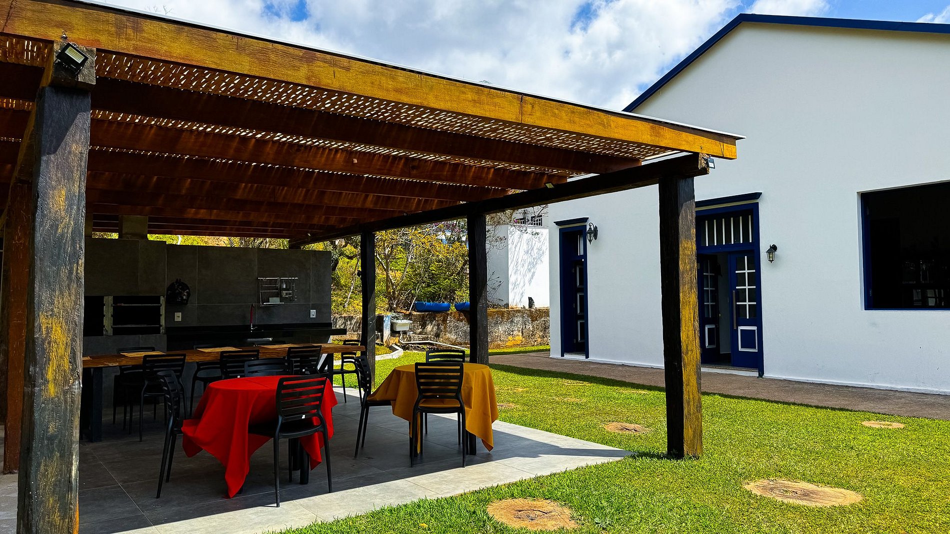 Área externa com churrasqueira embutida, grande mesa de madeira, cadeiras, além de 8 mesas plásticas com cadeiras extras