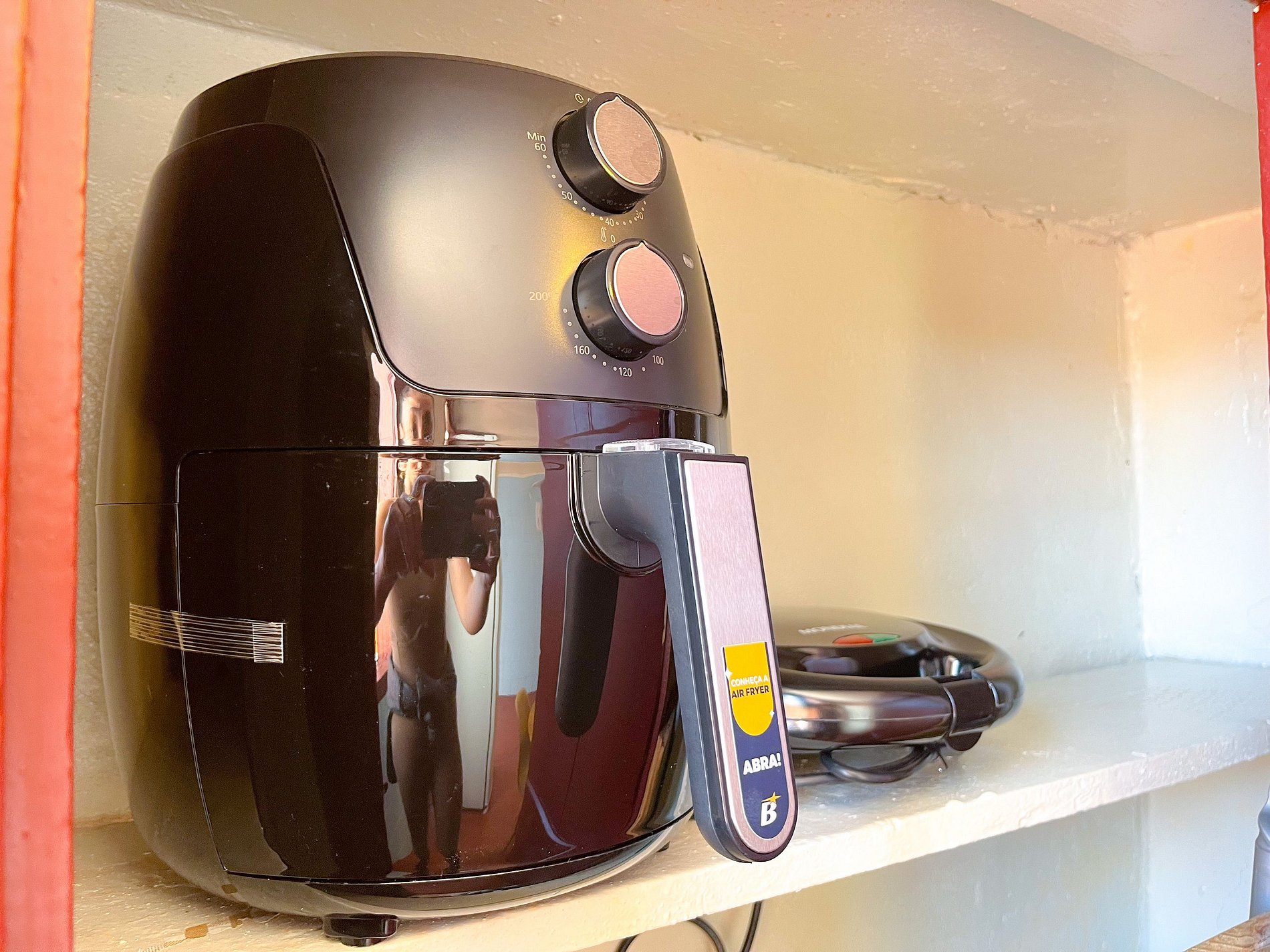 Cozinha completa com geladeira, fogão, micro-ondas, airfreyer e utensílios