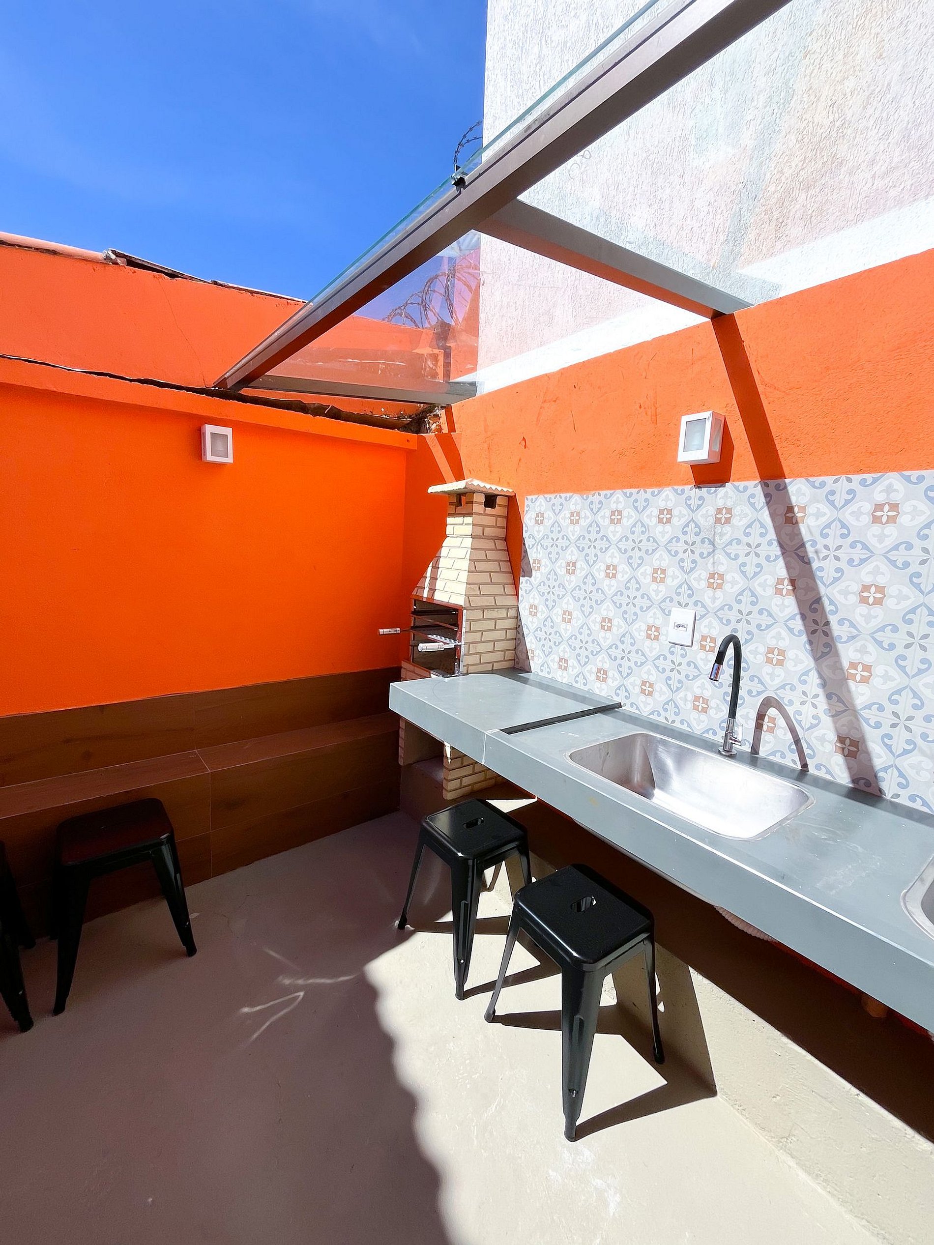 Área externa com tanque e churrasqueira fixa cobertos. Mesa e banquinhos para área externa.