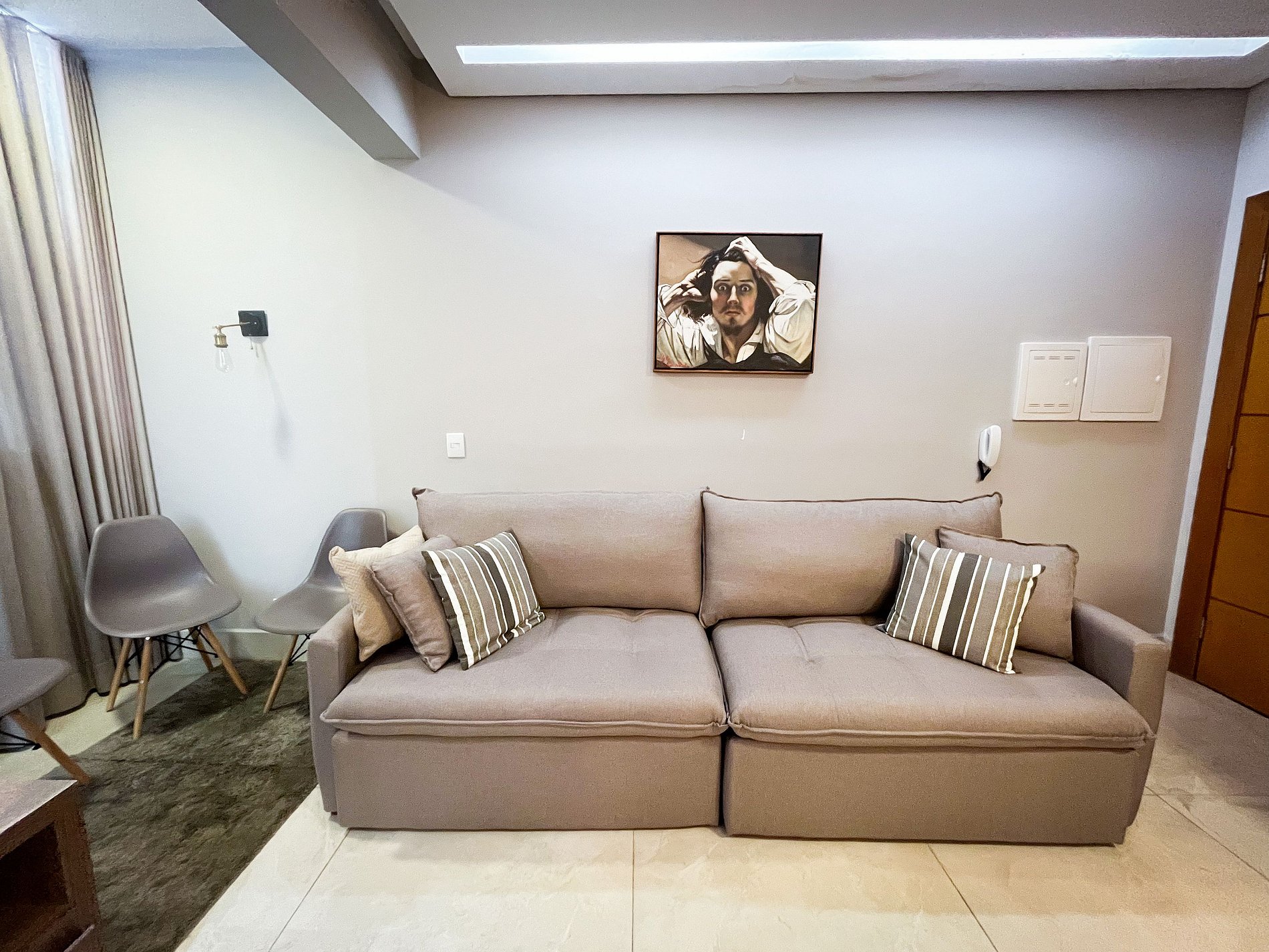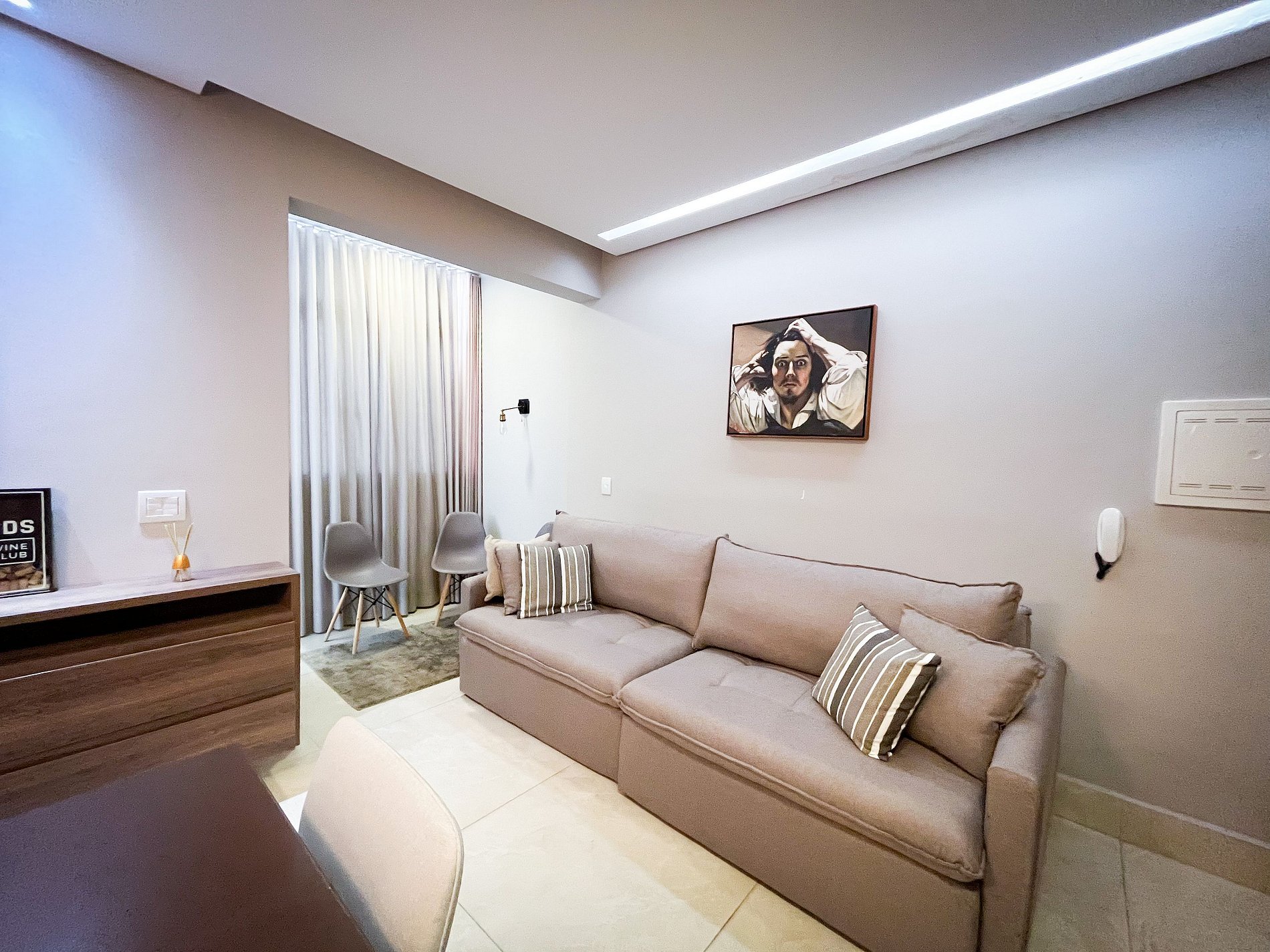 A decoração combina elementos modernos com referências à arte e à tradição europeia, que criam uma atmosfera de serenidade e personalidade. O espaço conta com ar-condicionado, banheiro completo, wifi, TV Smart, cozinha equipada e 1 vaga de garagem privativa.