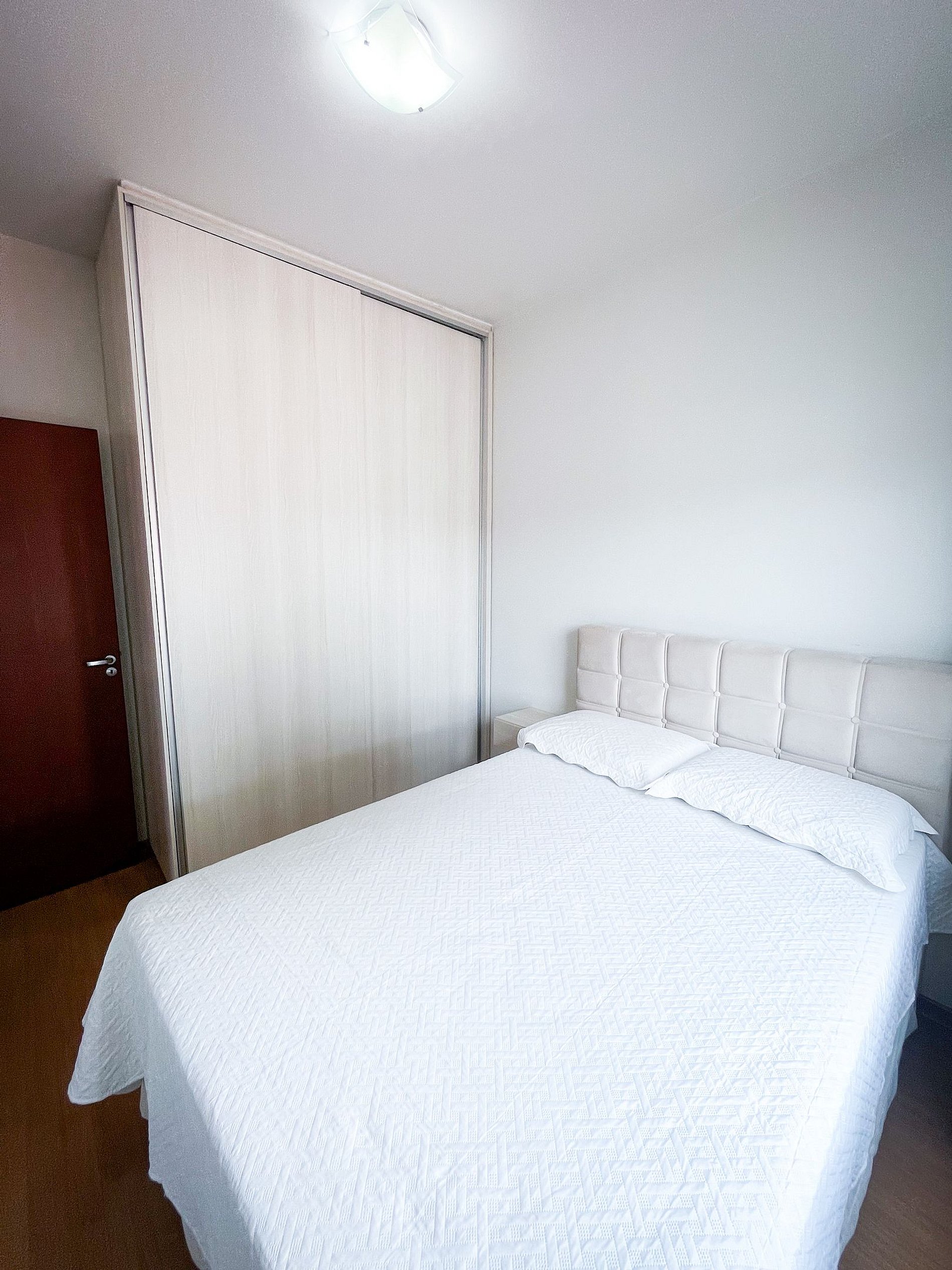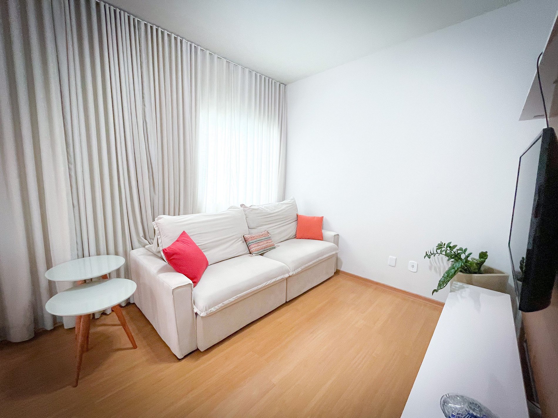 O apartamento é cuidadosamente planejado para oferecer funcionalidade e aconchego: conta com 1 suíte com varanda, 1 quarto adicional, 1 banheiro social, sala e copa integradas, cozinha completa e compacta, bem equipada, e lavanderia interna com máquina de lavar roupas.