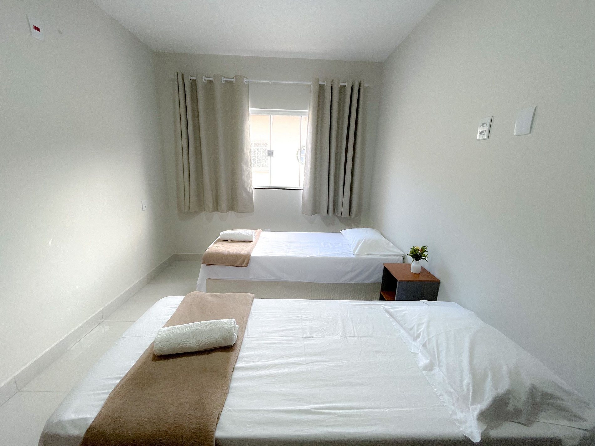 Quartos: O apartamento possui dois quartos, sendo um deles uma suíte. Ambos os quartos equipados com 02 camas de solteiro, adaptáveis a se tornarem cama de casal.