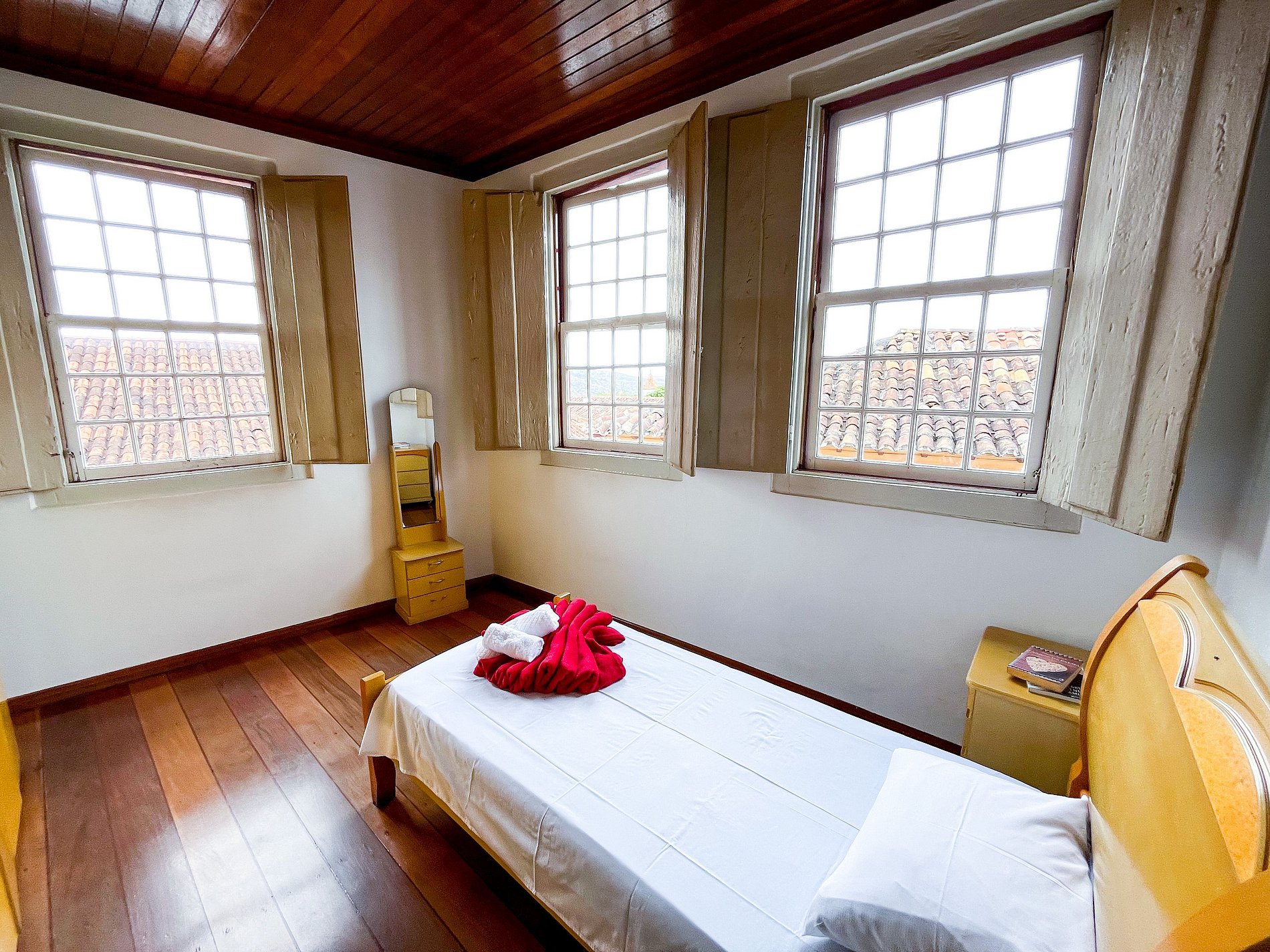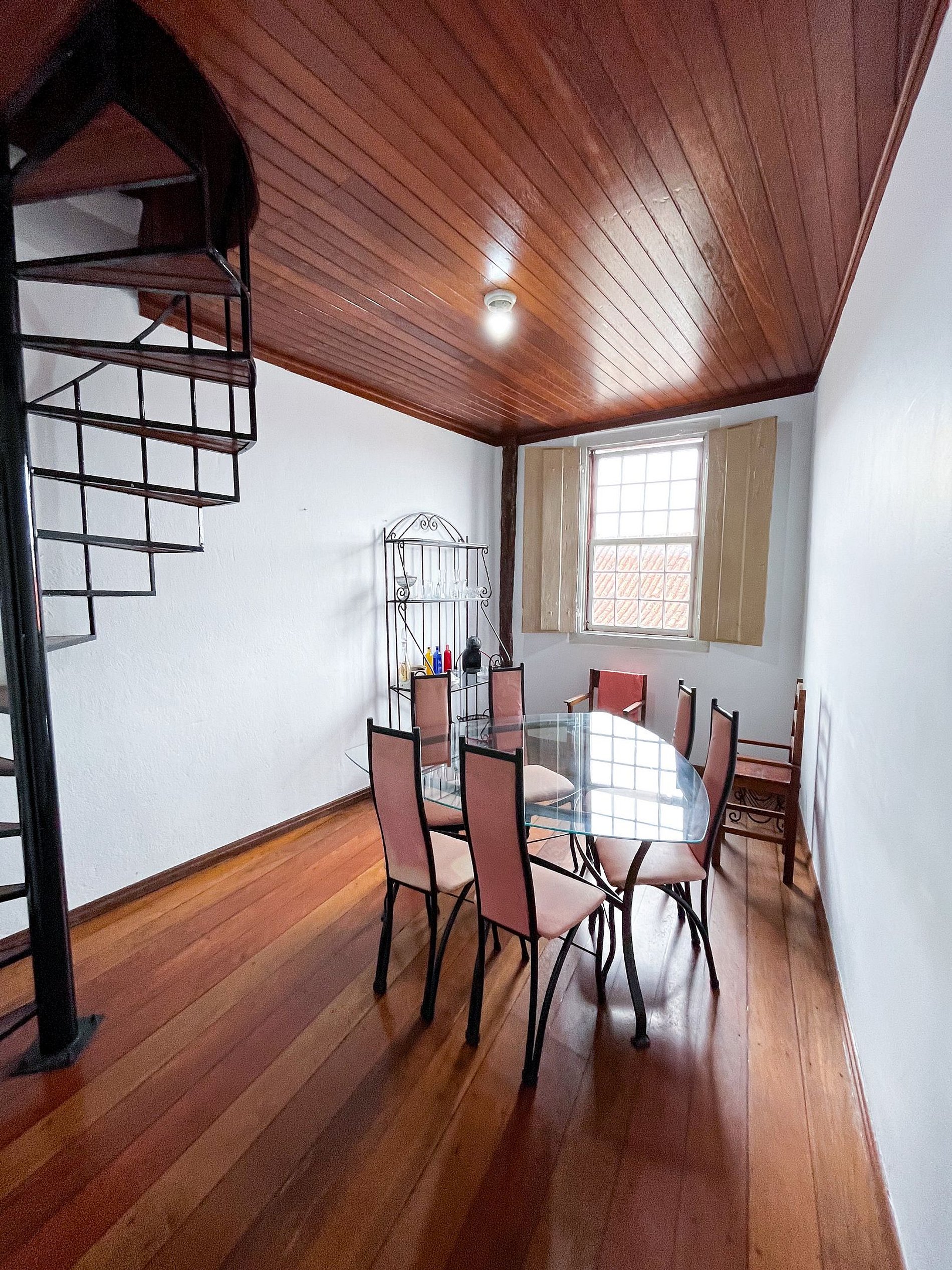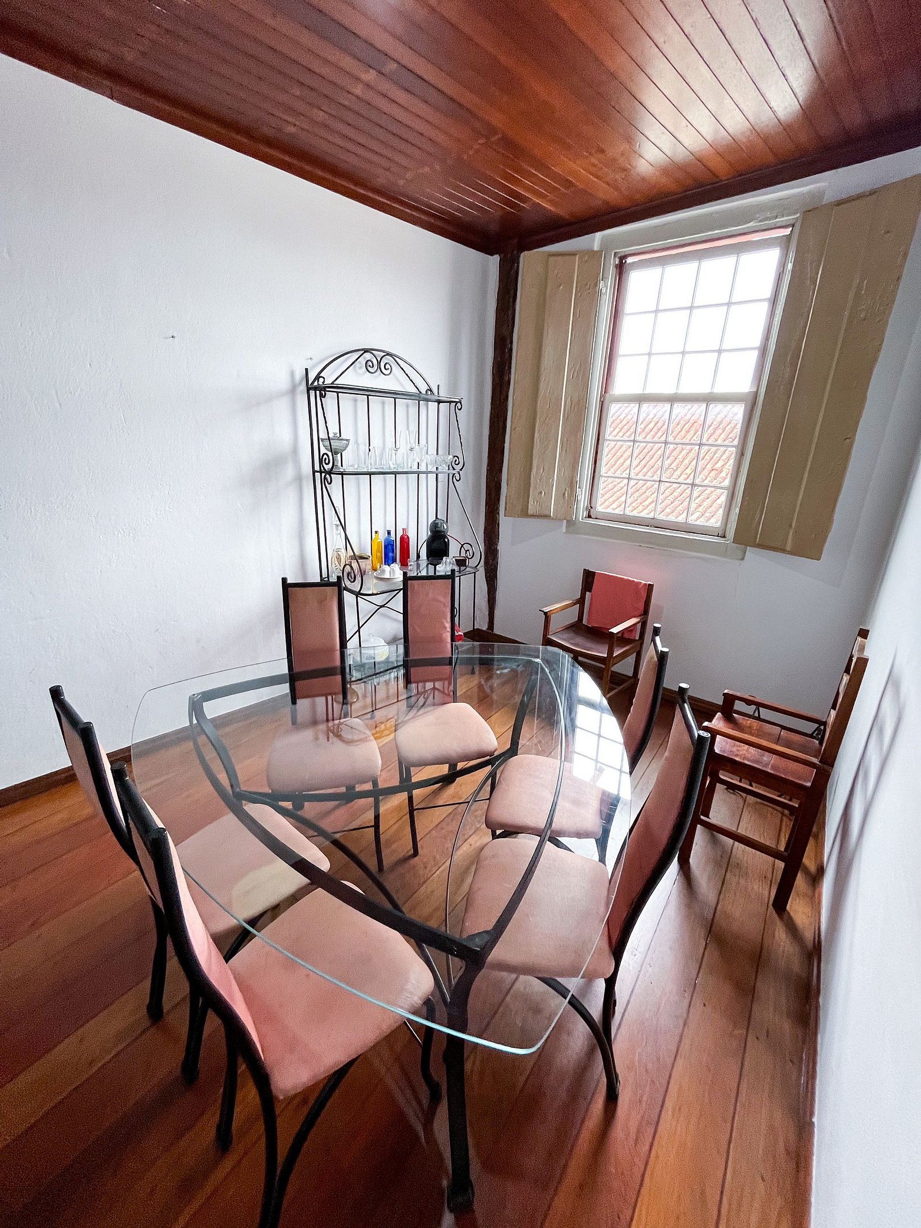A decoração respeita os traços coloniais originais, com mobiliário cuidadosamente escolhido para manter a atmosfera histórica, sem abrir mão do conforto para o dia a dia.