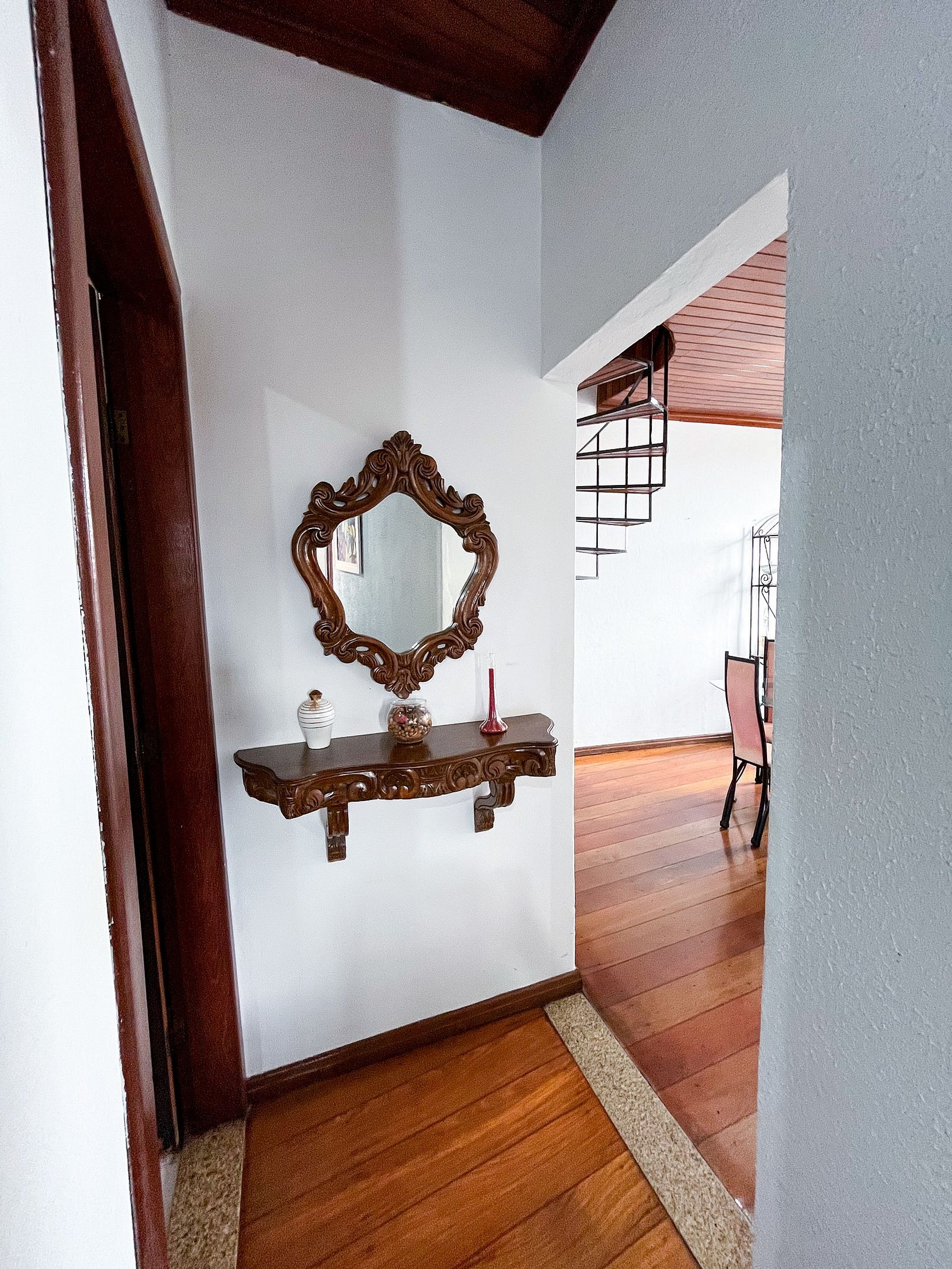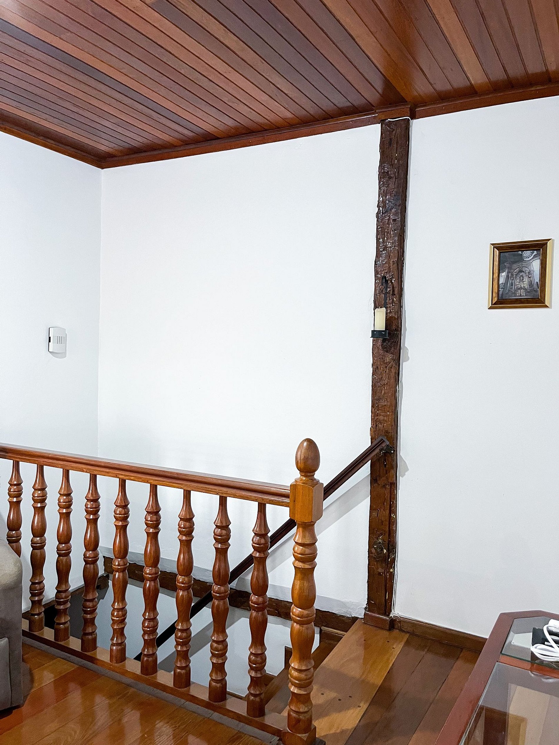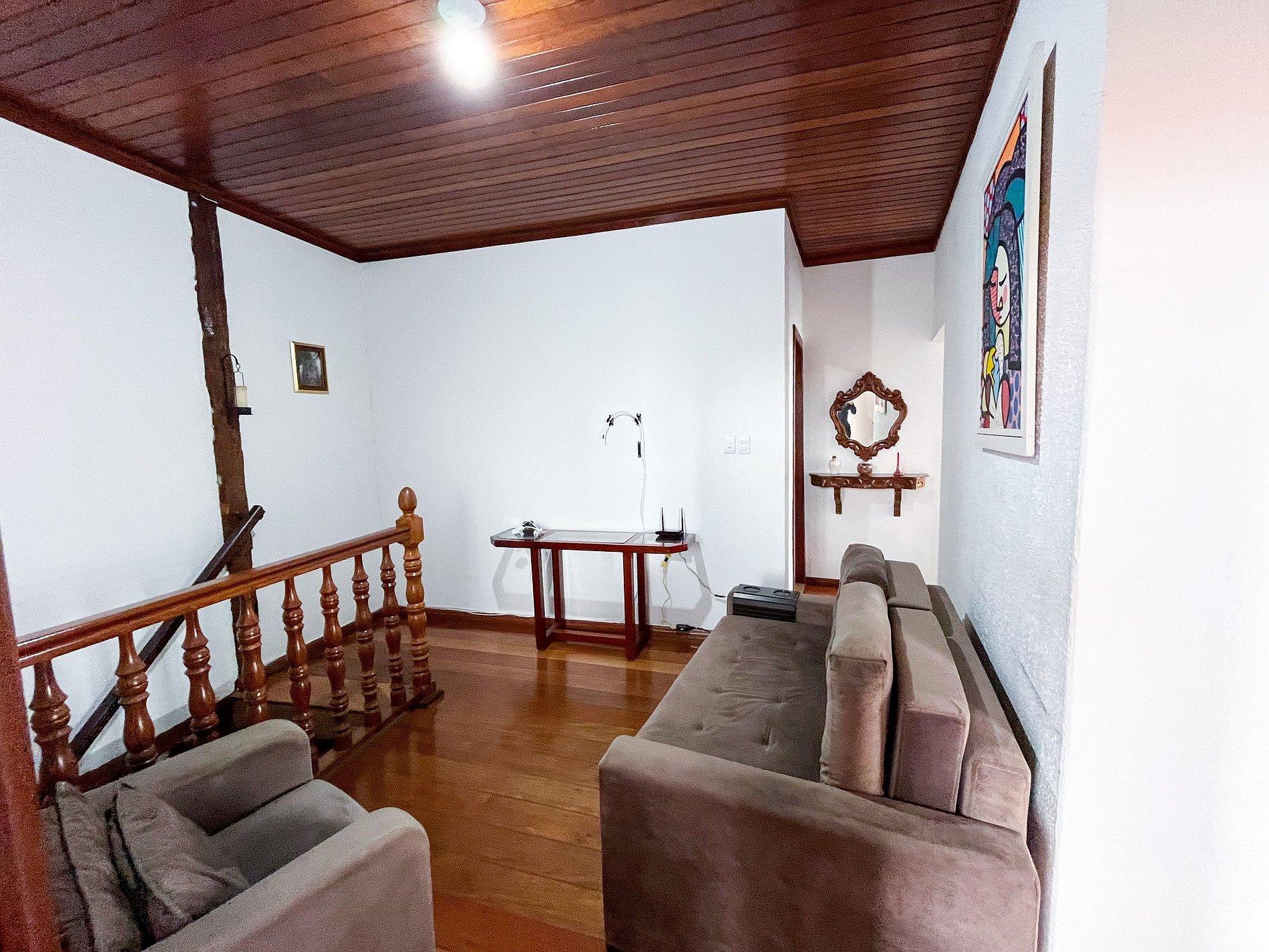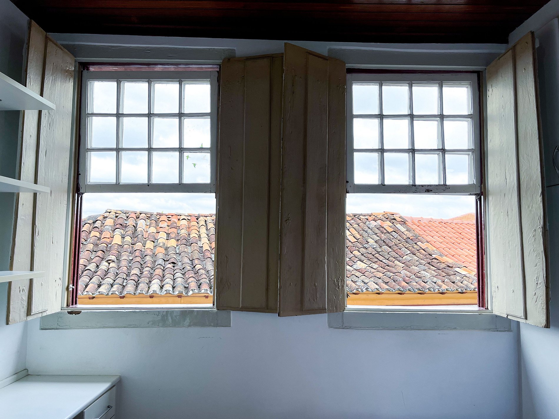 A decoração respeita os traços coloniais originais, com mobiliário cuidadosamente escolhido para manter a atmosfera histórica, sem abrir mão do conforto para o dia a dia.