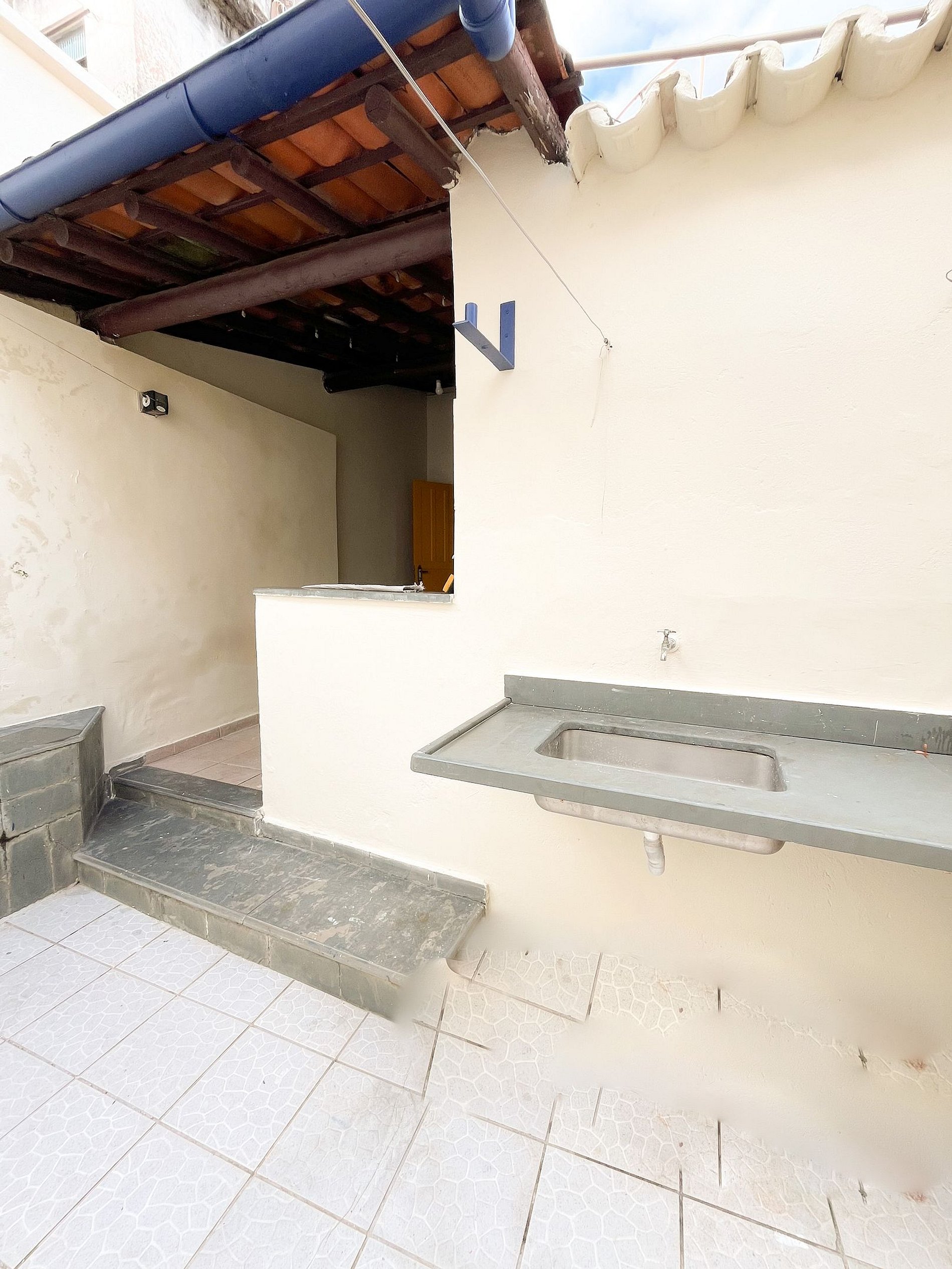 Área externa com tanque e churrasqueira fixa e ducha.