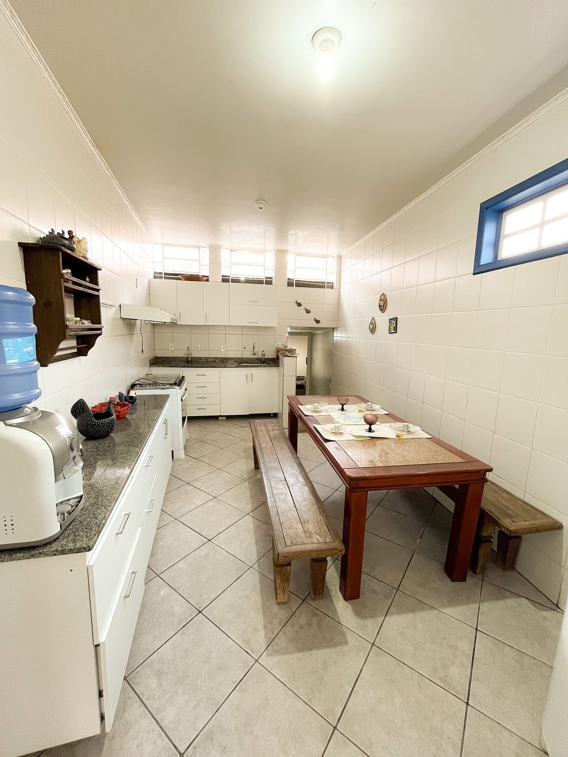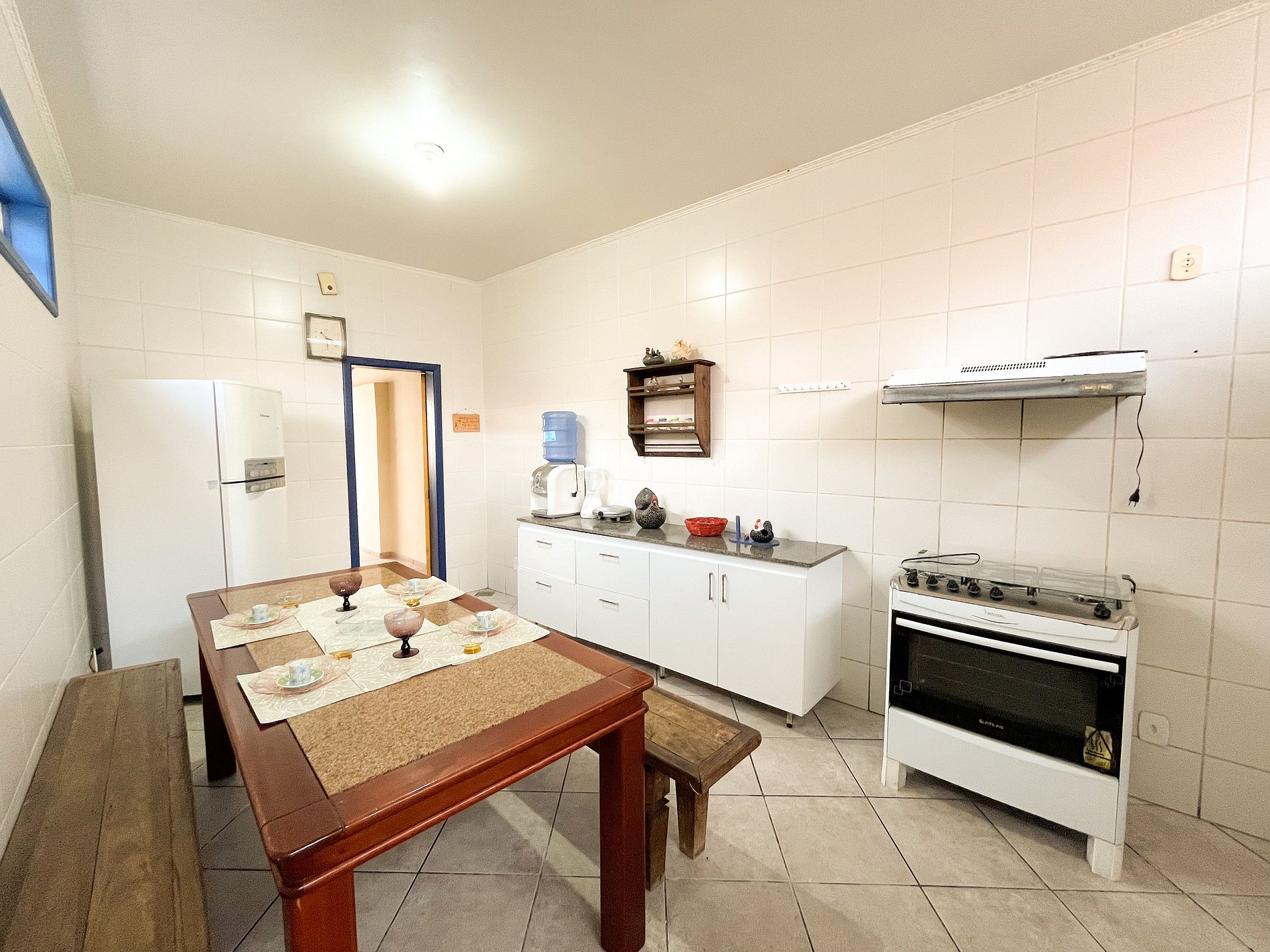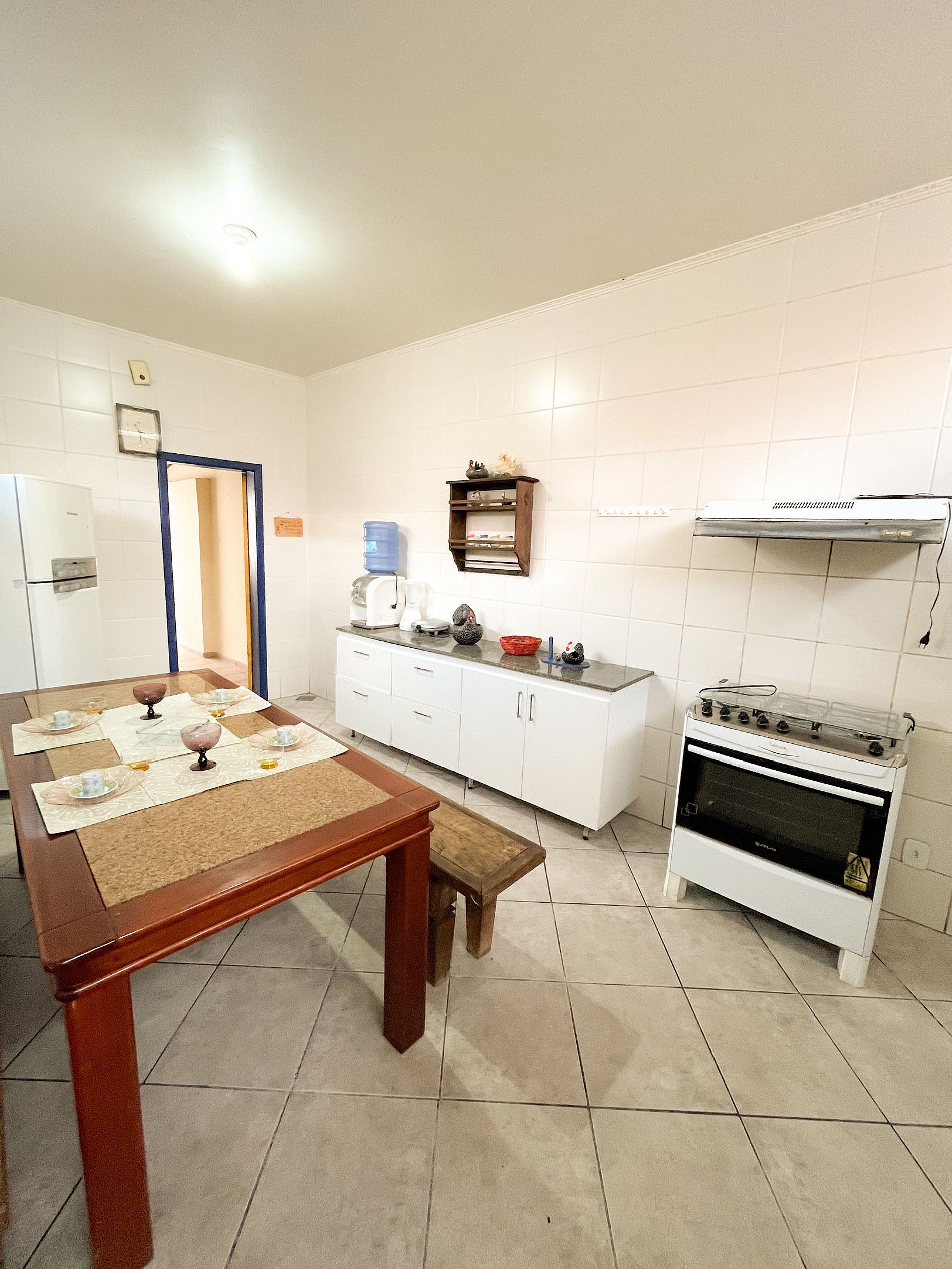 01 cozinha grande equipada com fogão, geladeira, filtro de água, sanduicheira e microondas