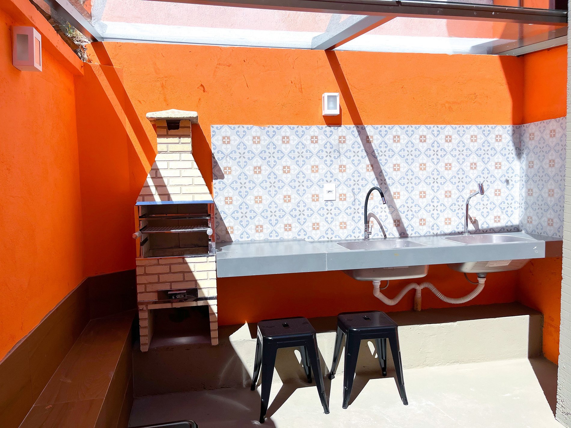 Área externa com tanque e churrasqueira fixa cobertos. Mesa e banquinhos para área externa.