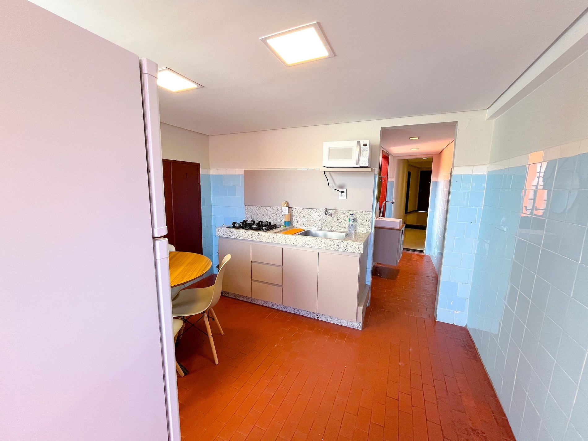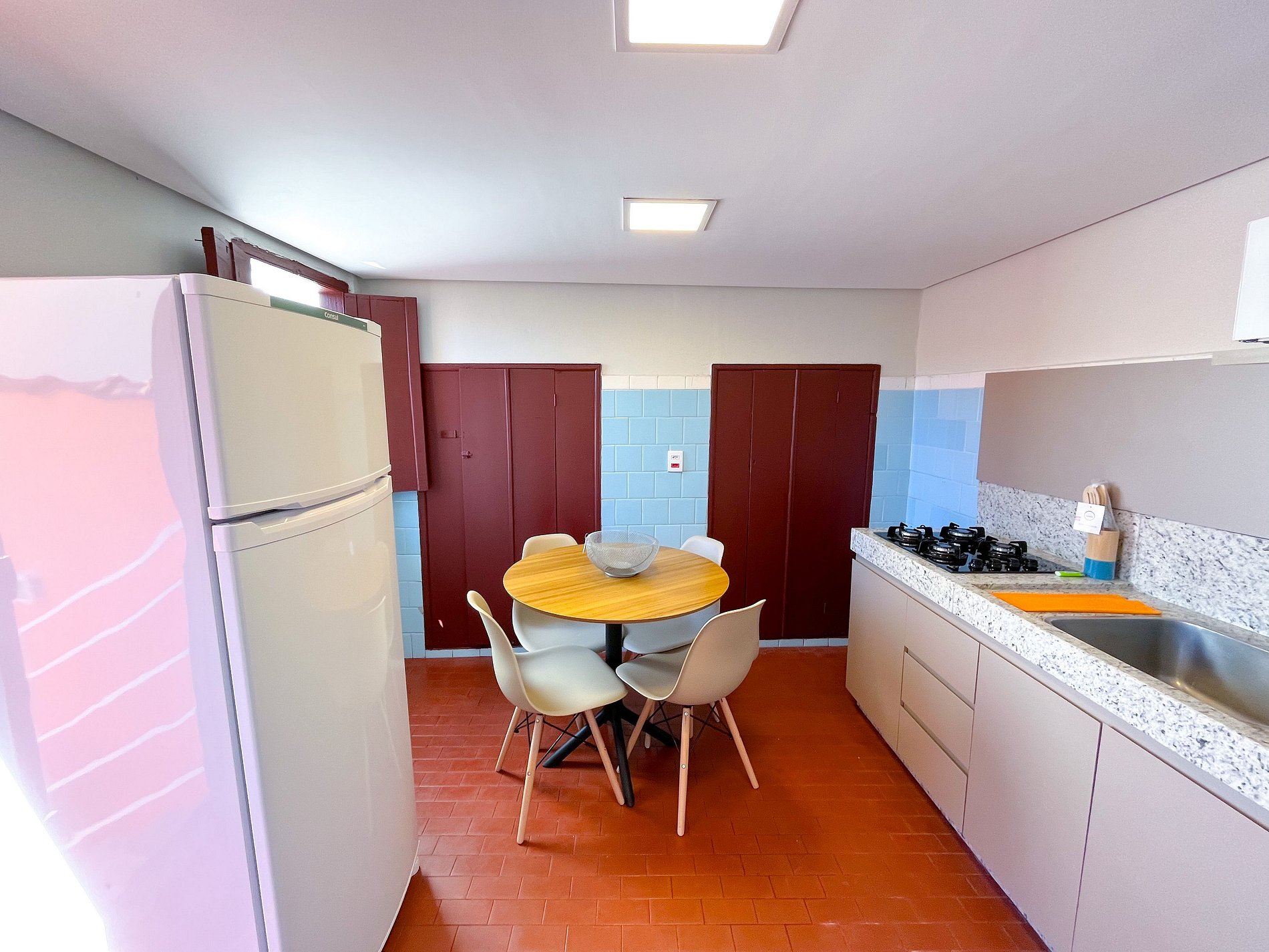 Cozinha completa com geladeira, fogão, micro-ondas, airfreyer e utensílios