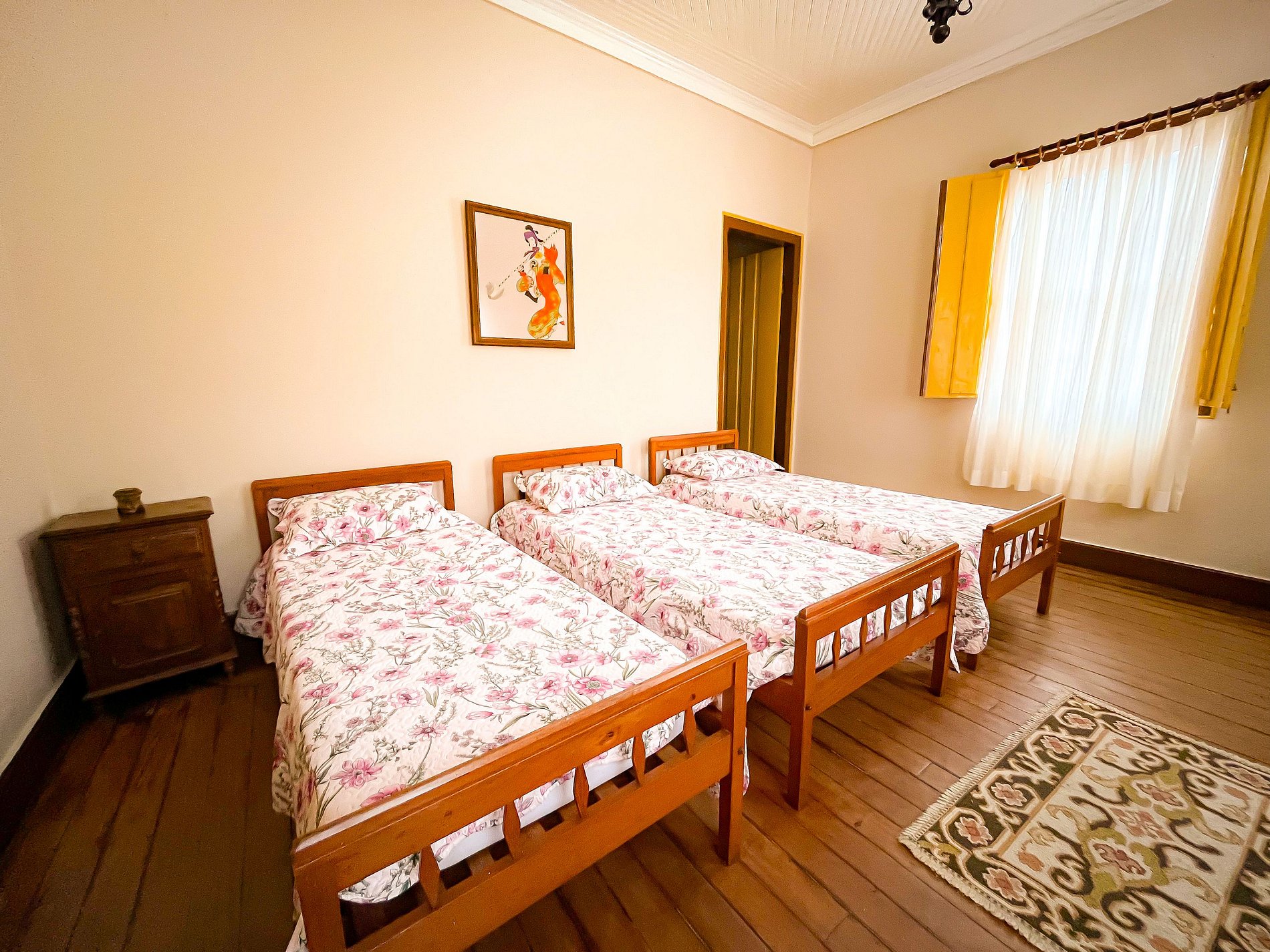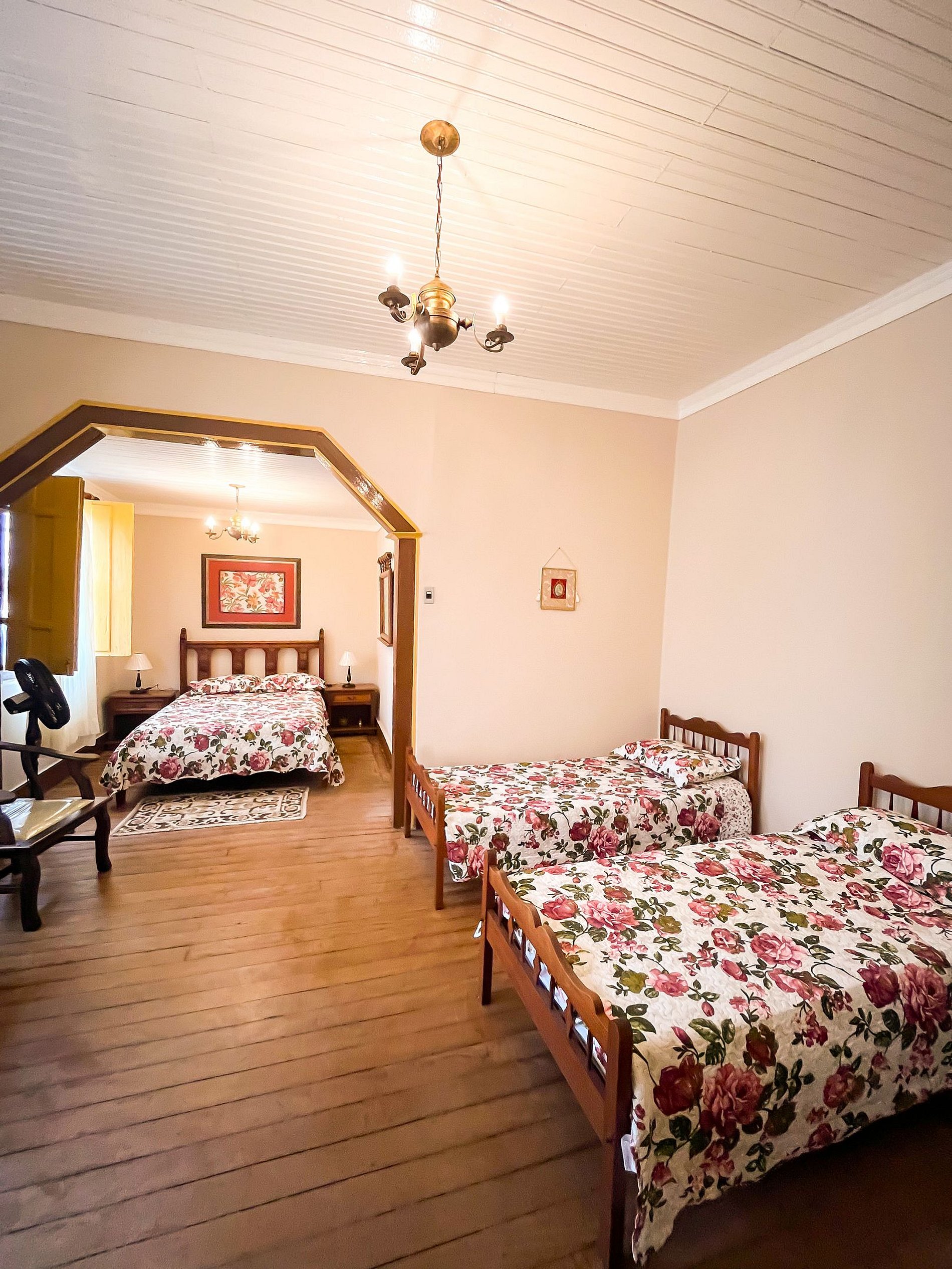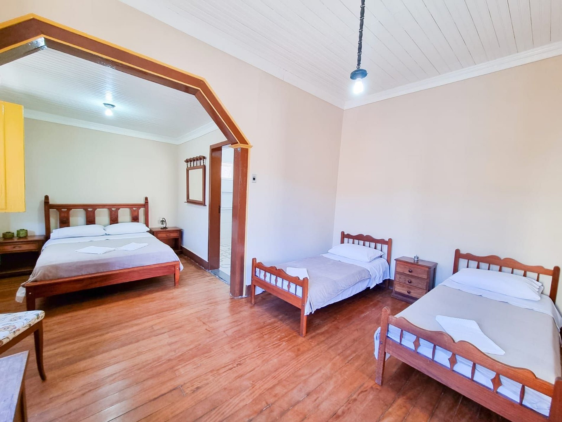 Quarto 01: Uma suíte com uma cama de casal e duas de solteiro, ideal para famílias ou grupos;
